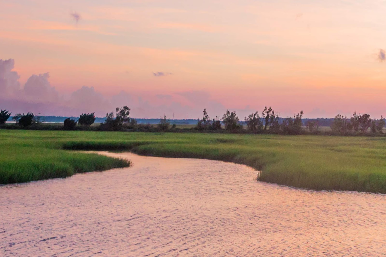 Sunset over marsh grass at high tide - Brunswick Landing Marina